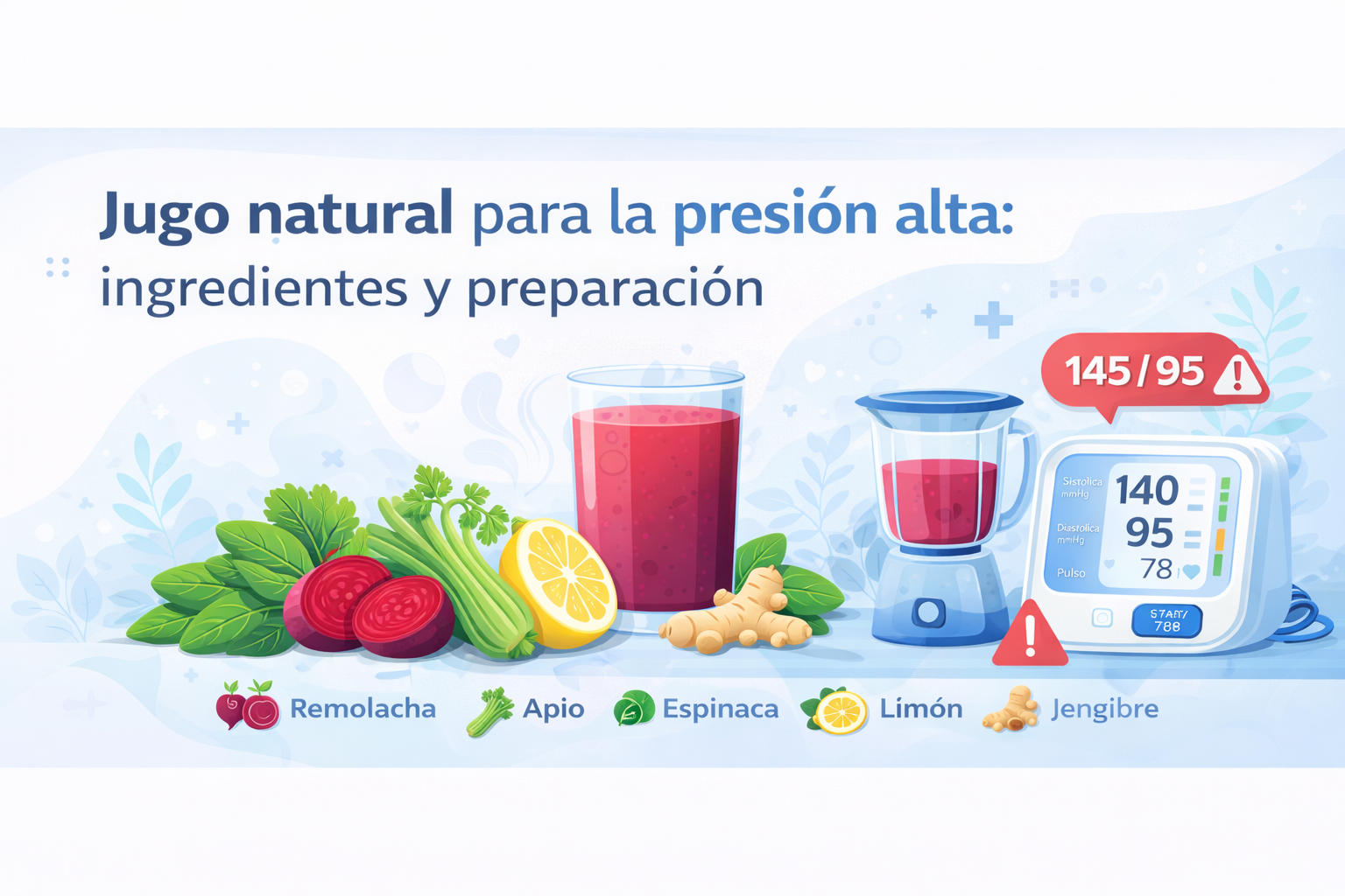 El jugo natural para la presión alta que aquí se presenta es una alternativa alimenticia dentro de una dieta equilibrada, no una solución médica ni un sustituto del tratamiento indicado por un profesional de salud. La hipertensión arterial es una condición que requiere diagnóstico y seguimiento médico. Si presentas valores elevados de forma consistente, experimentas síntomas cardiovasculares o ya tienes un tratamiento activo, consulta siempre a tu médico antes de introducir cambios significativos en tu alimentación o rutina diaria.