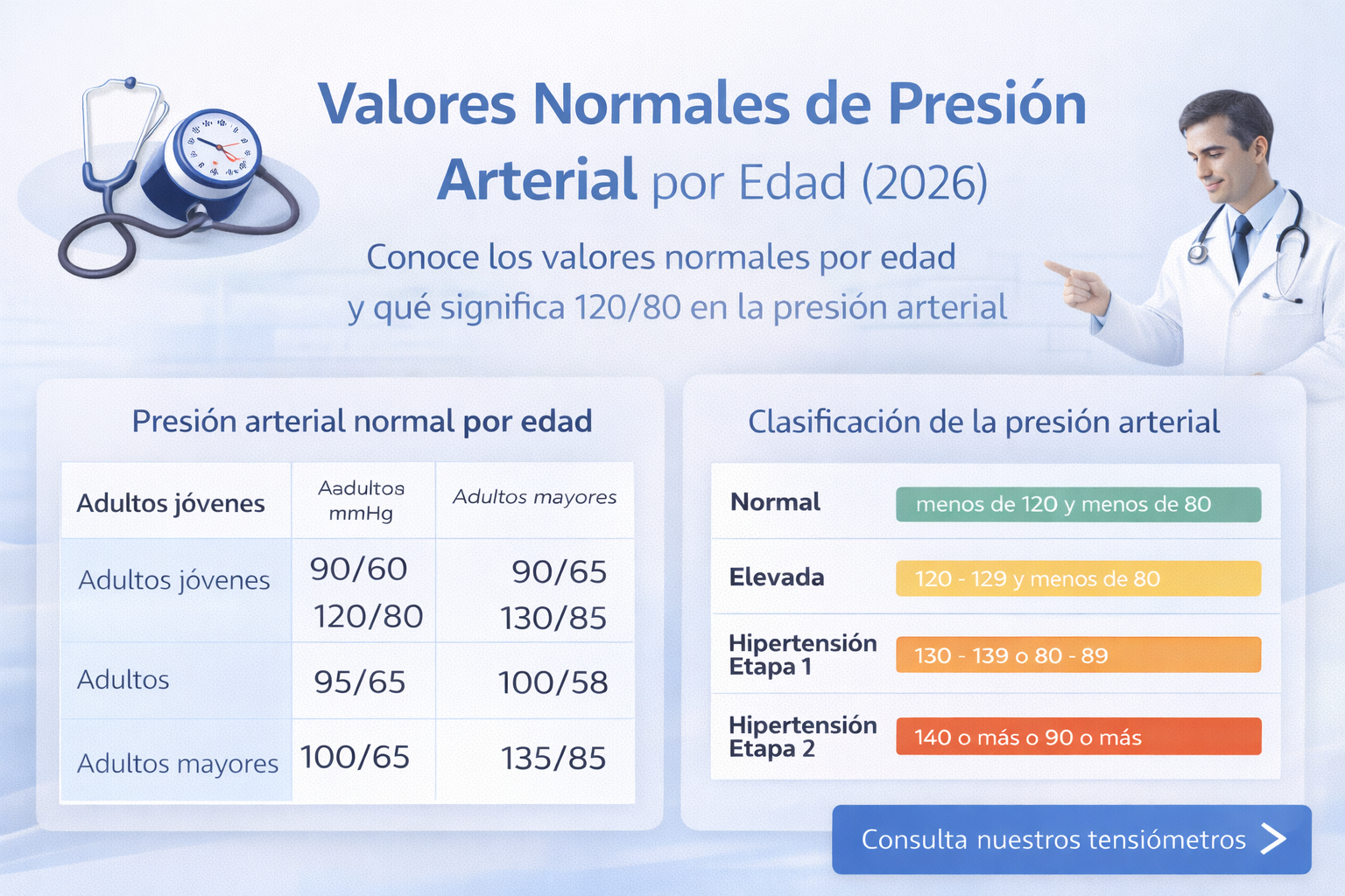 En esta guía actualizada para 2026 encontrarás una explicación clara de la clasificación de la presión arterial, una tabla con los rangos orientativos por grupo de edad y las recomendaciones clave para interpretar tus mediciones correctamente.
